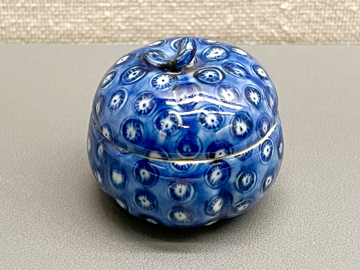 《祥瑞蜜柑丸文香合》は蓋の頂部に茎がつまみのようになっており、この種の香合はその器形から蜜柑香合と呼ばれます。