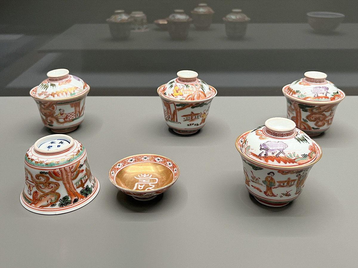 永樂和全の作品展示室5にも続きます。《淀屋金襴手写吸物碗》は淀屋金襴手茶碗の図柄を吸物碗に写したものですが、図柄を身と蓋に分け、描写もアドリブを利かせています。