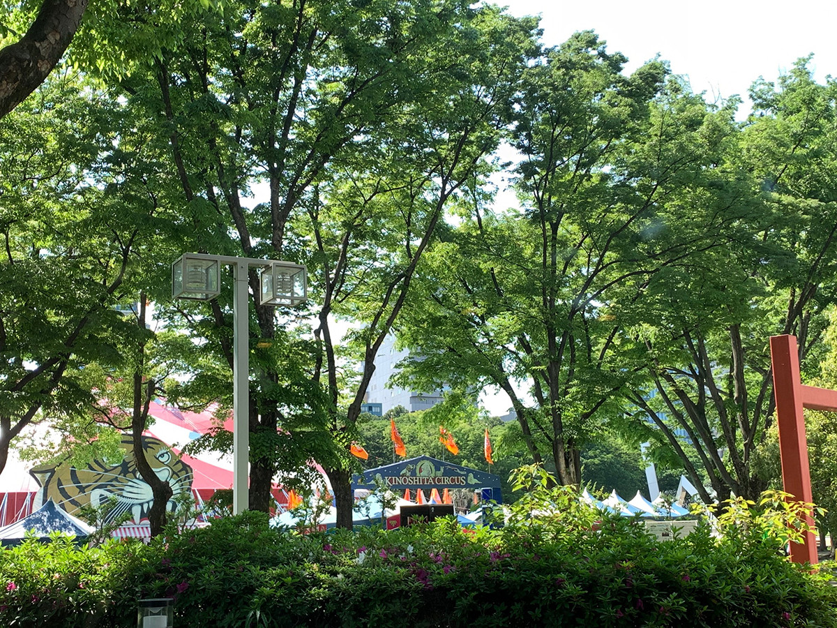展示を見終わり美術館のカフェに入ると、窓から大きなトラの描かれたサーカスのテントが見えました。テントの前には親子連れがずらりと並んでいます。 催し物は別ですが、こちらのテントも「布」の造形なので親近感を感じました。