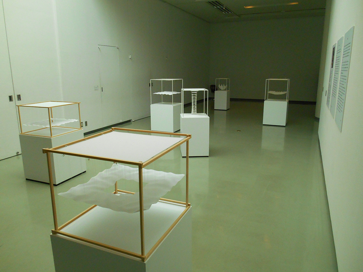 会場の入口には、〈白い布による空間〉シリーズのマケットが並んでいます。このサイズだと、実際の作品では見えない作品上部の様子がよくわかります。中ほどのマケットだけ斜めに配置されています。他のマケットとは正面の向きが違うのでしょうか。