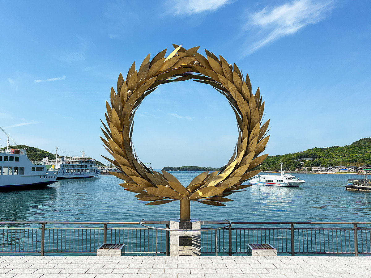 島の玄関口で出迎えてくれるのは、オリーブの葉を王冠のかたちに仕立てた彫刻です。小豆島は言わずと知れたオリーブの名産地です。