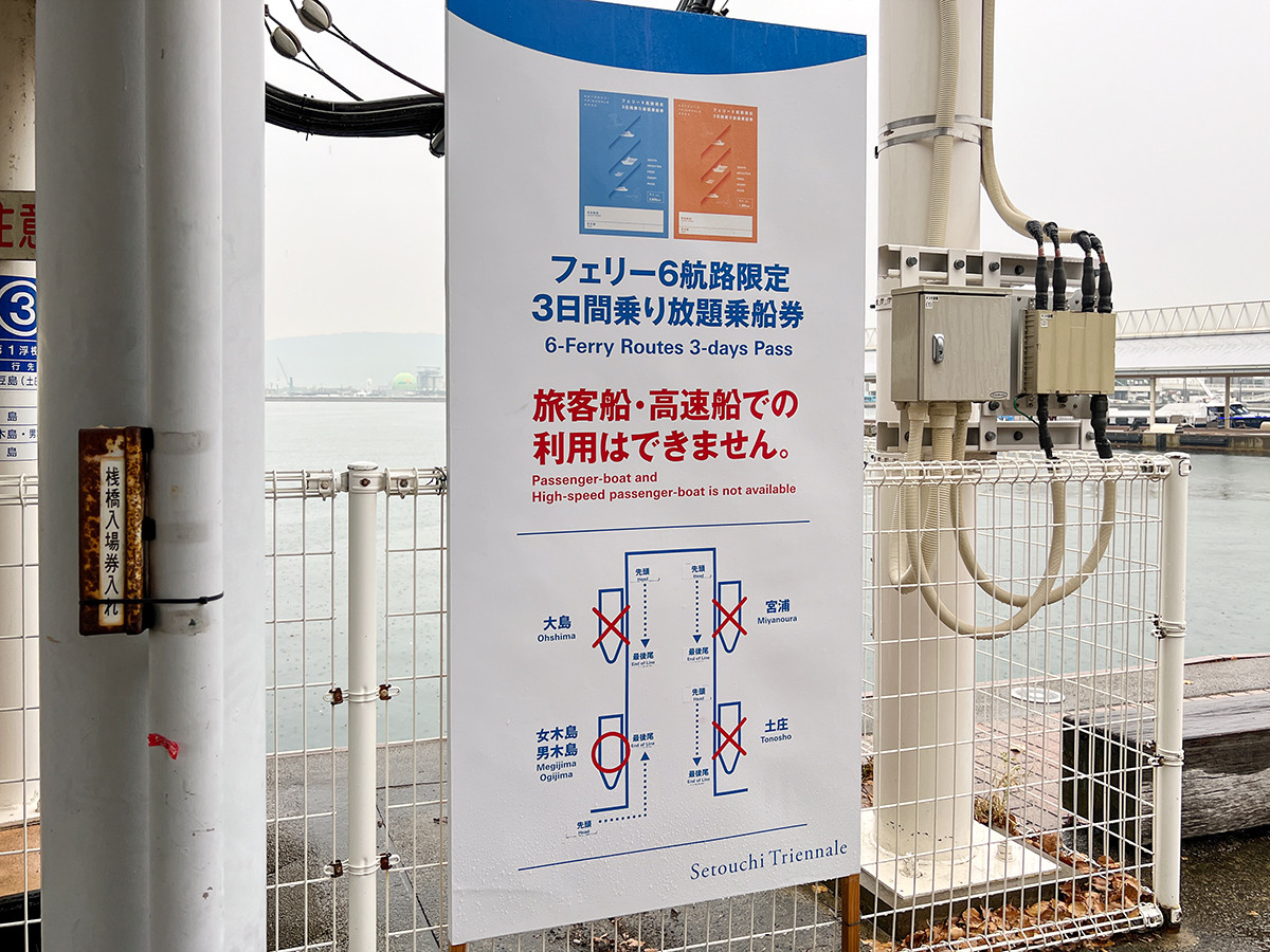 高松からだと直島(宮浦港)までは共通乗船券。直島から豊島経由で犬島までは別料金です。