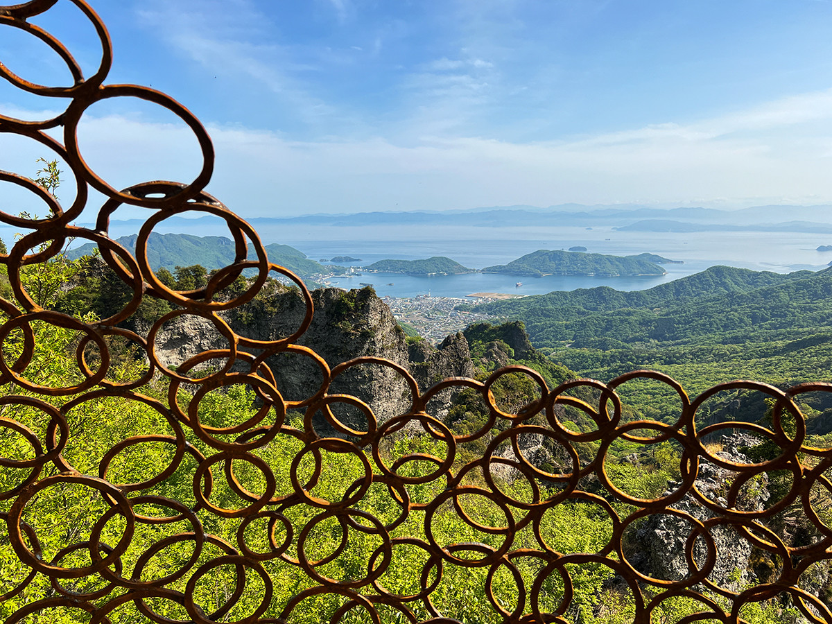 立地は、大渓谷と瀬戸内海を一望できる寒霞渓(かんかけい)。小豆島のほぼ中心で、奇岩の渓谷美として知られる有名な景勝地です。鉄の輪とのコントラストで、素晴らしい眺めを楽しめます。