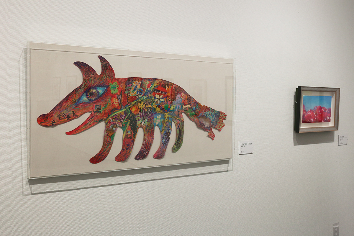 (左から)鴻池朋子《Little Wild Things》2015年 / 富田有紀子《赤い長方形》2015年