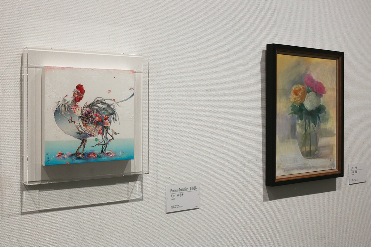 (左から)入江明日香《Premices Printaniers 春の兆し》2015年 / 卯野和宏《バラ》2014年