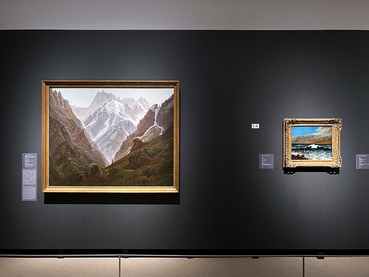 自然界の崇高さをあらわす存在として、屹立する高山や広大な海は格好の画題になりました。カールスが描いたのは堂々たるモンブランの大氷河、クールべは渦巻くように生成される波を描いています。
