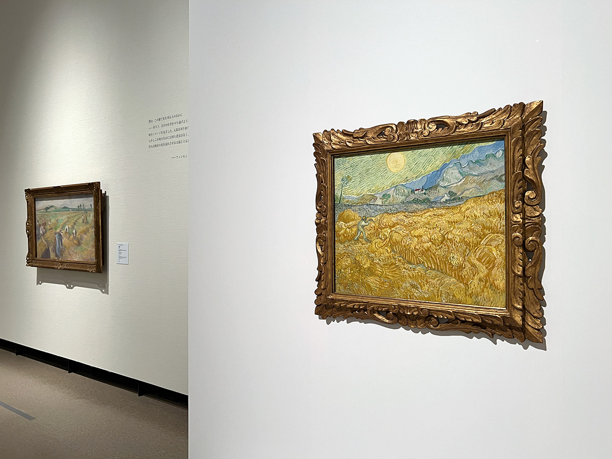 展覧会の目玉である《刈り入れ(刈り入れをする人のいるサン=ポール病院裏の麦畑)》は、ファン・ゴッホが晩年に取り組んだ風景画の代表作です。麦を刈る人物に「死」を、刈られる麦のなかに「人間」のイメージを見たとされており、本展が初来日です。
