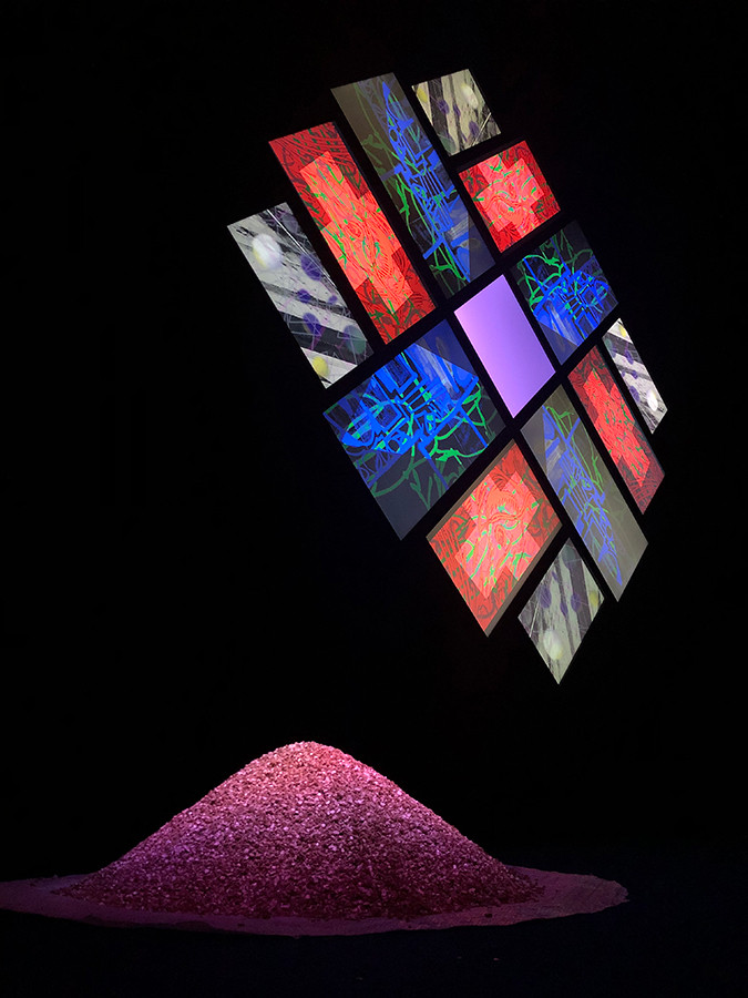 “Visual Music”(ヴィジュアル・ミュージック)界の代表作《77 Million Paintings》は、音と光が途切れることなく変化するインスタレーションです。靴を脱ぎ展示場に入ると大きなスクリーンが飛び込んできます。枝をカットした跡のある木の柱、ソファが数台。前方には小さな砂が盛られ、そこにはライトが当てられています。環境問題に取り組む彼の思想を表現しているのでしょうか。