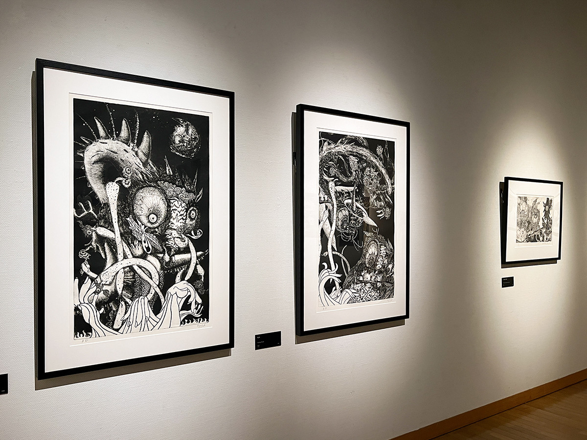 銅版画との出会いは幼少期の絵本から。初期作品では銅版画のほか墨絵やペン画など、モノクロームの線描を主軸にした作品が目立ちます。