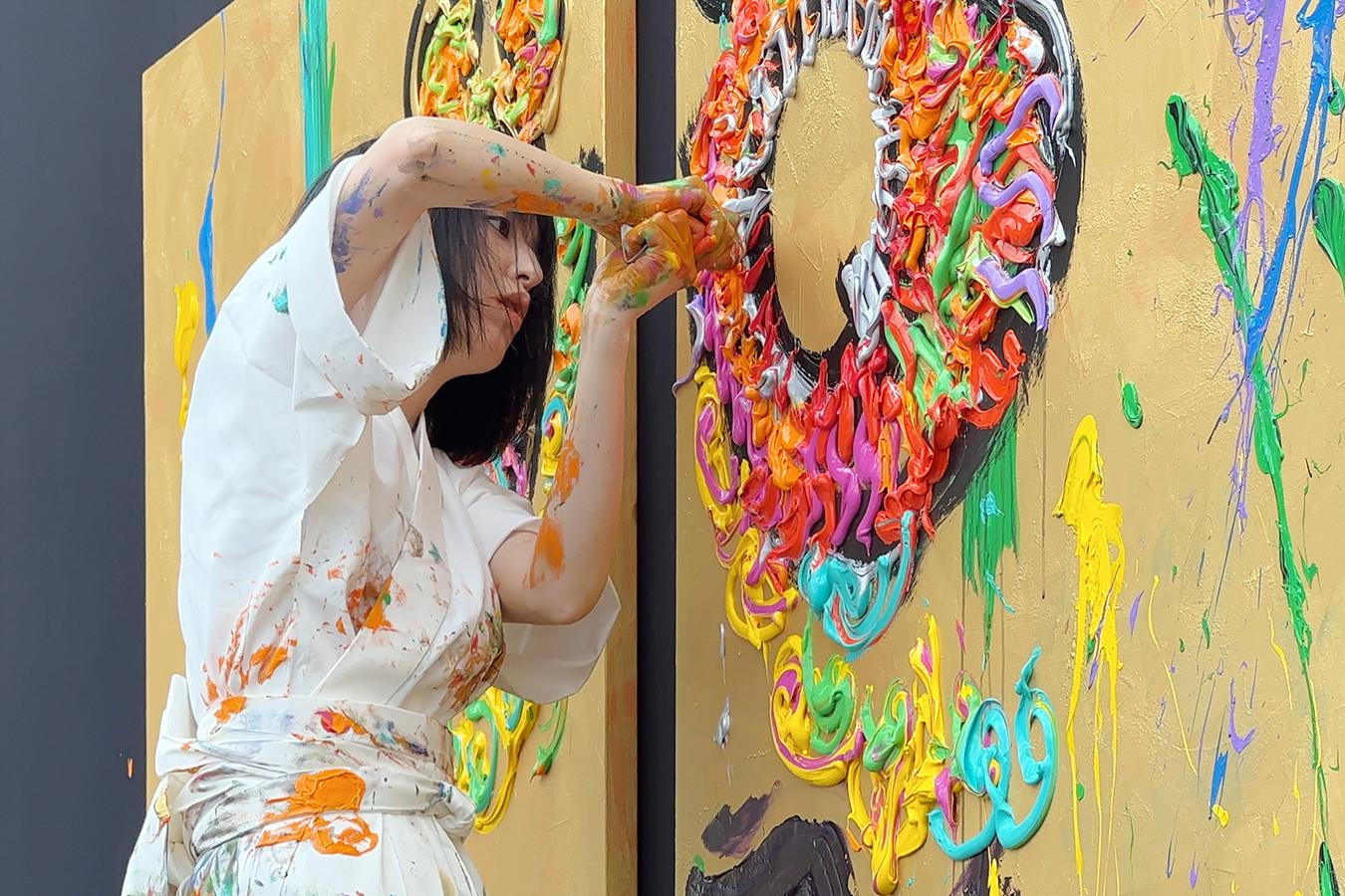 ライブペインティングにより「祈り」というテーマを力強い表現をする美術家、小松美羽(1984-)。エネルギッシュな制作は、多くのファンから注目を集めています。