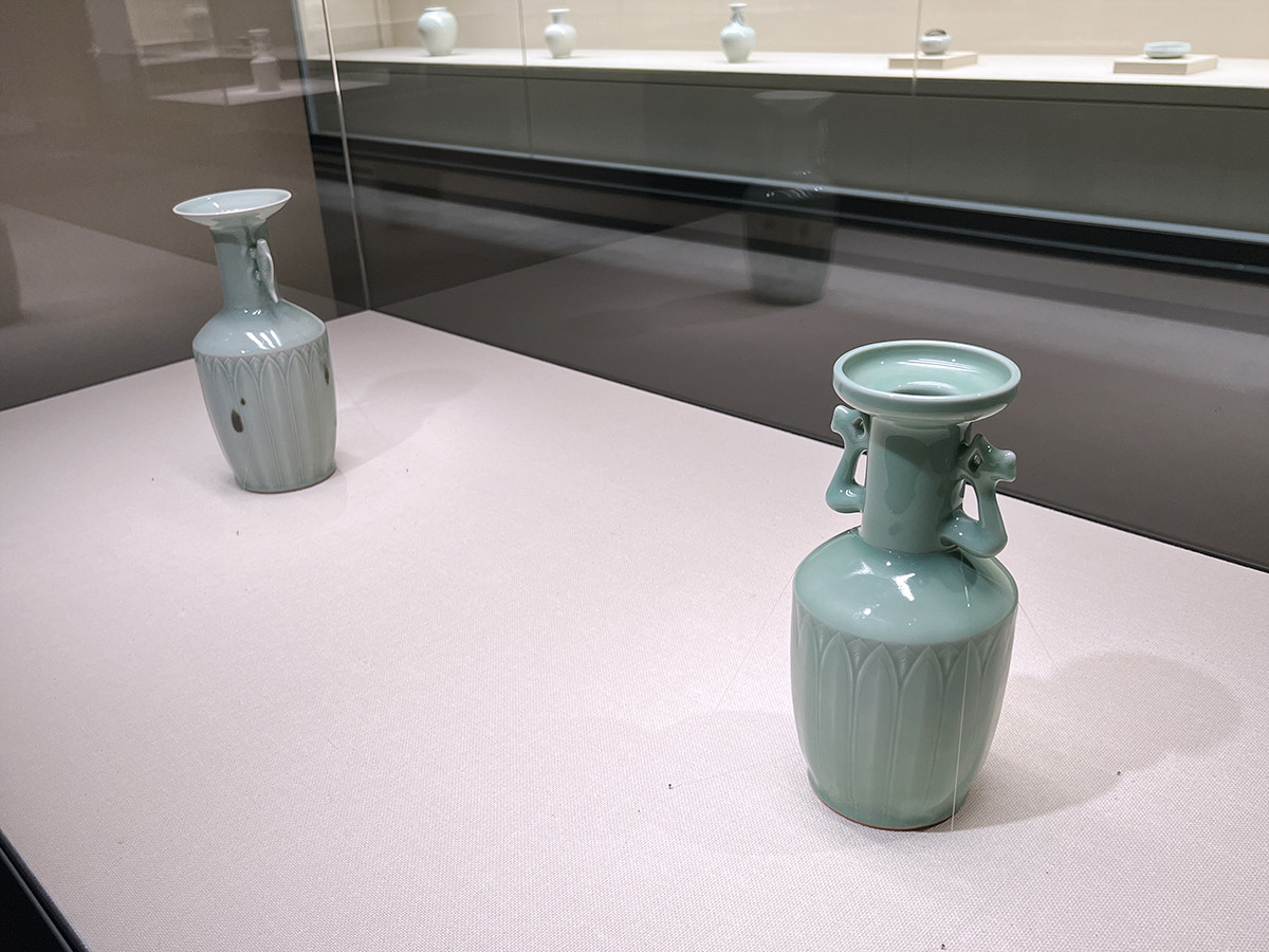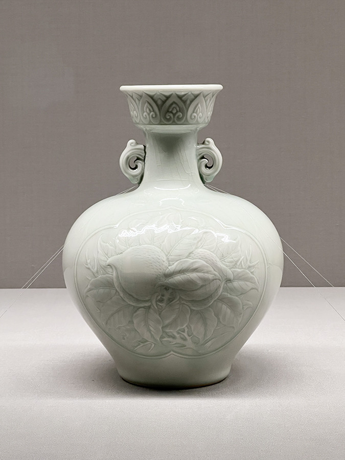 (左奥から)《青磁鯉耳花瓶》昭和時代前期 / 《青磁鎬文鳳耳花瓶》昭和38年(1963)
