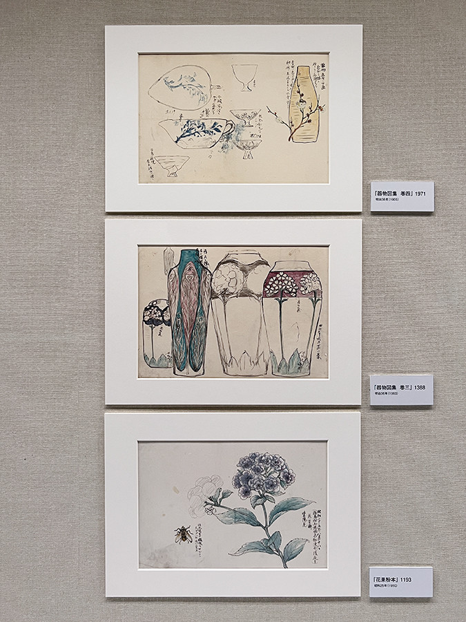 特集4「素描集─自然体の波山とその眼差し」には、波山の素描が並びます。波山は生活の中で目に留まった草花や動物だけでなく、博物館などでアジアをはじめ様々な国や地域の陶磁、金属、染織の工芸品を観察し、美濃紙や画仙紙に描き留めていました。出光美術館は約2,200枚の素描を所有しています。