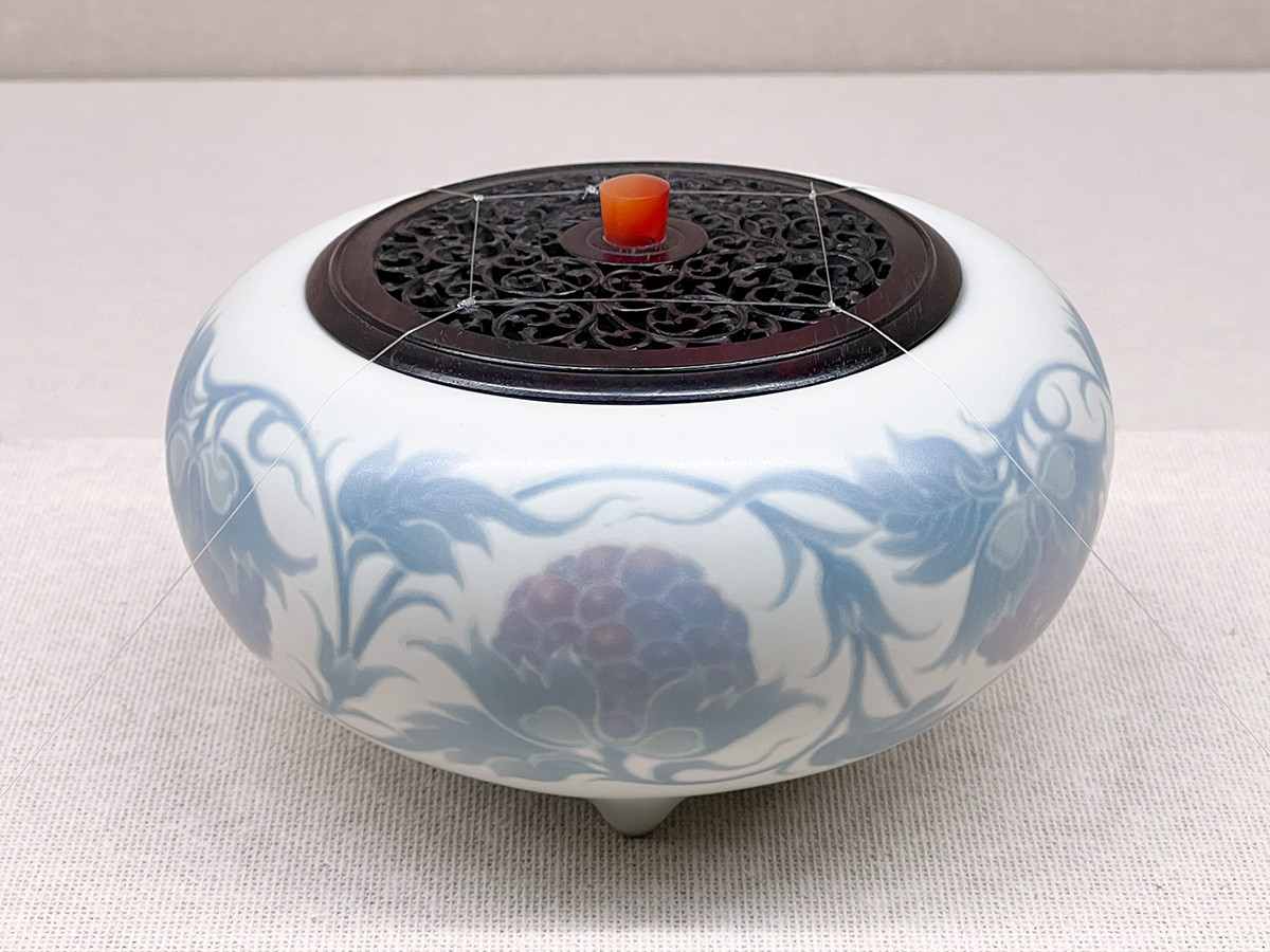《葆光彩磁葡萄文香爐》は、出光佐三による波山コレクションの第一号です。佐三は大正13年頃、大学時代の先輩宅で波山の白磁壺を見て深く感動した、と伝わります。