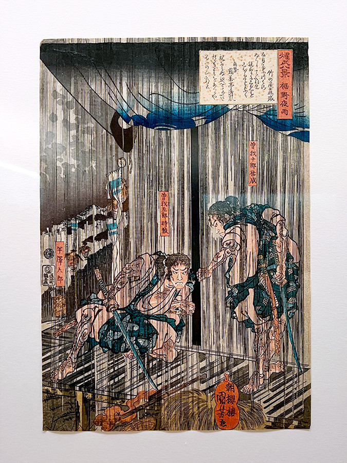 《燿武八景 裾野夜雨》は、土砂降りの雨の中、曽我兄弟が父の仇である工藤祐経の寝所を伺っている場面。大河ドラマでは、本当の目的は仇討ちではなく頼朝暗殺だったという大胆な設定でした。
