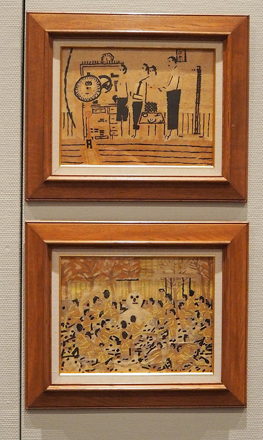 八幡学園時代の作品 上/《身体検査》貼絵 1937年 下/《雪だるま》貼絵 1937年