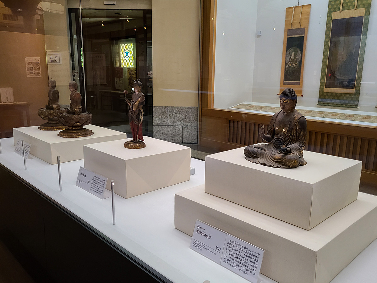 (左)菩薩坐像 鎌倉時代 建仁元年(1201) 快慶 伊豆山浜生協会 (中央)文殊菩薩立像 1軀 鎌倉時代 阿弥陀寺 (右)薬師如来坐像 1軀 鎌倉時代 東光禅寺