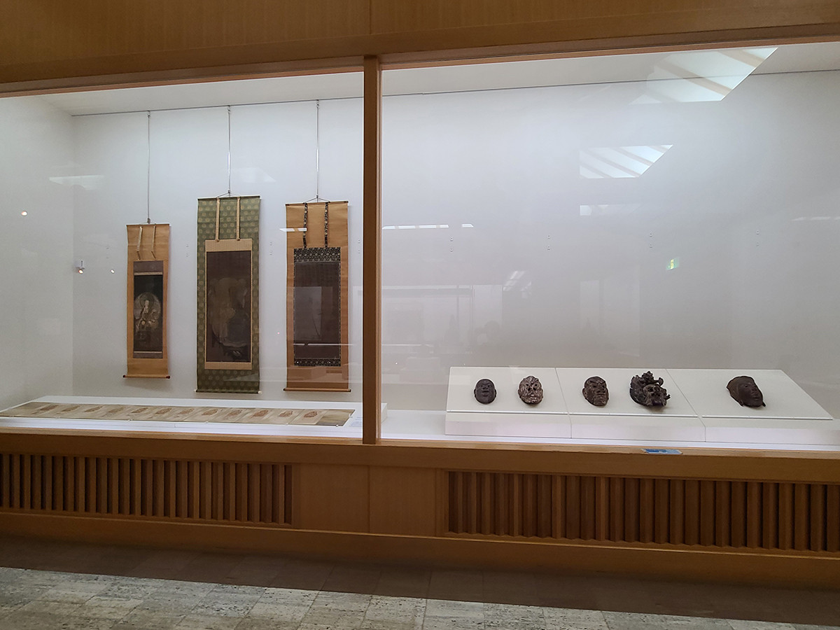右側は、源頼朝が東大寺の手向山八幡宮から贈られたと伝わる菩薩面。慶派仏師の手によるとみられます。左の軸は高僧の肖像画。