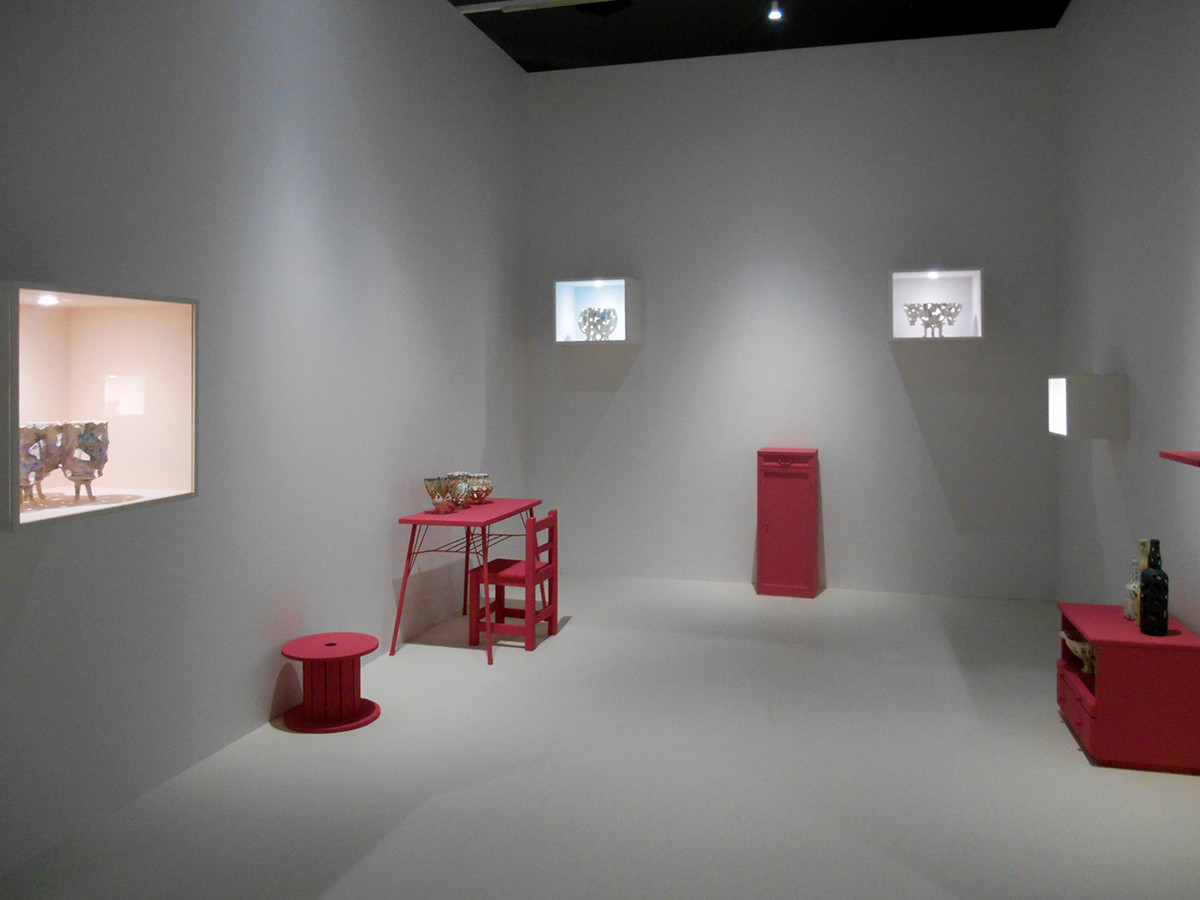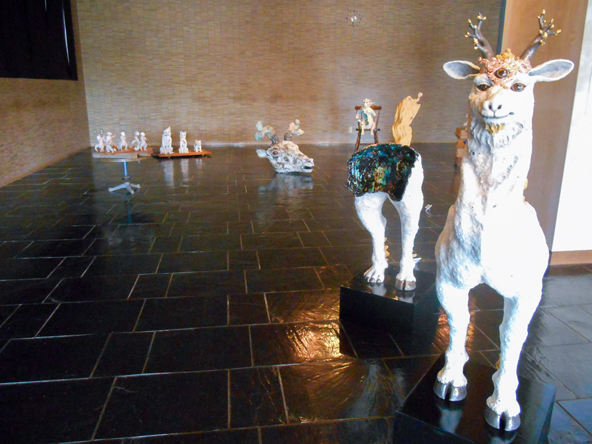 会場の南館で目を引いたのは、奥直子の不思議な生物たちです。 鹿に似た獣の胴体は大きく割れ、牛に似た獣の頭部にはうねった角が生えています。 割れた部分から作品の内側の空洞が見えることで、形は様々でも器を意識しているように思われます。