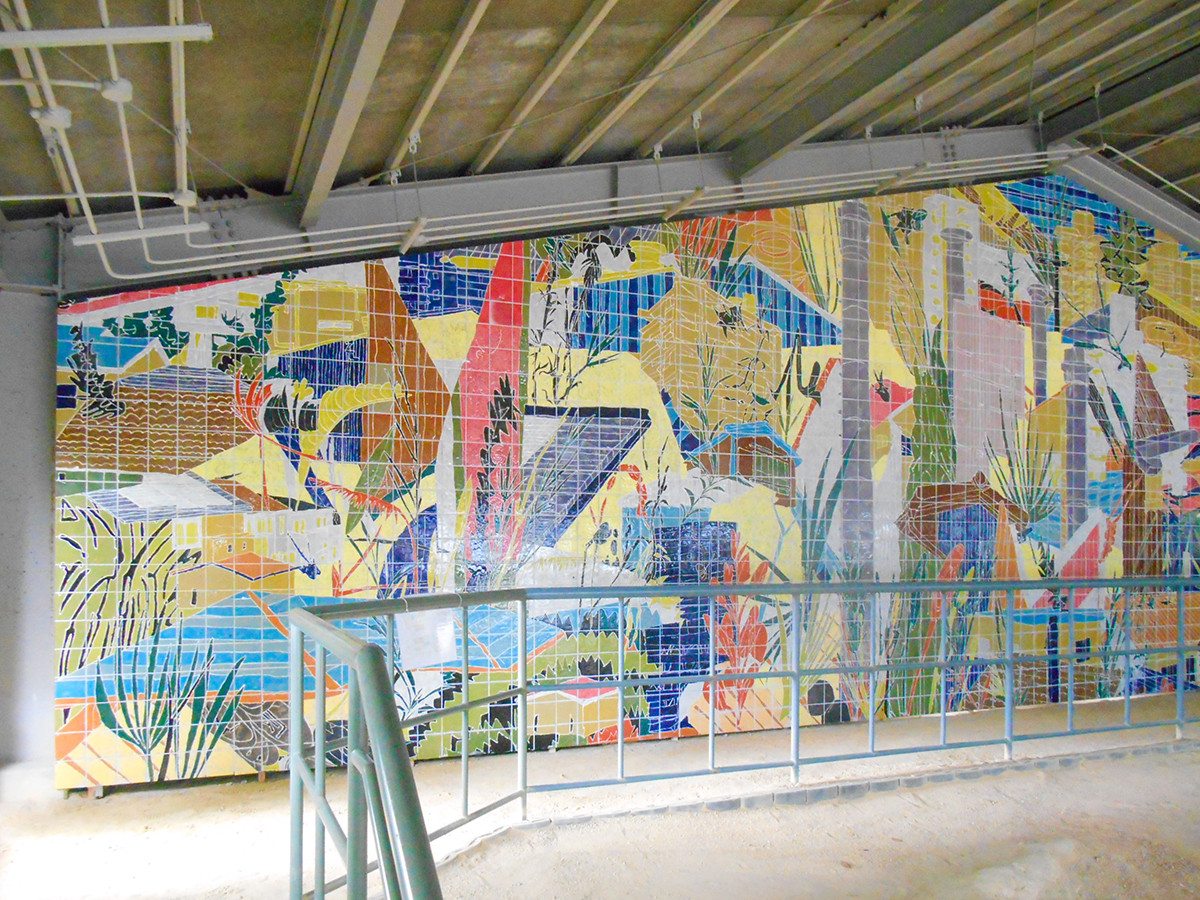 本館を出て、橋を渡って古窯館に向かいます。こちらには、本展の作品の中で一番大きな作品があります。この作品には、瀬戸のいろいろな建物や場所が描かれています。もしかすると、皆さんの見知った建物や場所かもしれません。