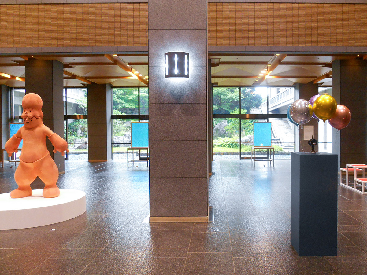 地下の展示室には、ものの質感の対比として、とても面白い作品があります。一方は、どっしりとした素焼きの埴輪の魔人、一方はふわふわと漂うカラフルなバルーンです。 同じ展覧会に並んで出品されているのがとても不思議に思われます。