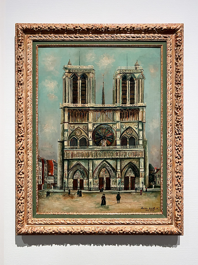 ユトリロは、エコール・ド・パリを代表する画家のひとりです。《ノートル=ダム》は、黒い輪郭線で正面から見た大聖堂を描き、立体感を強調しています。