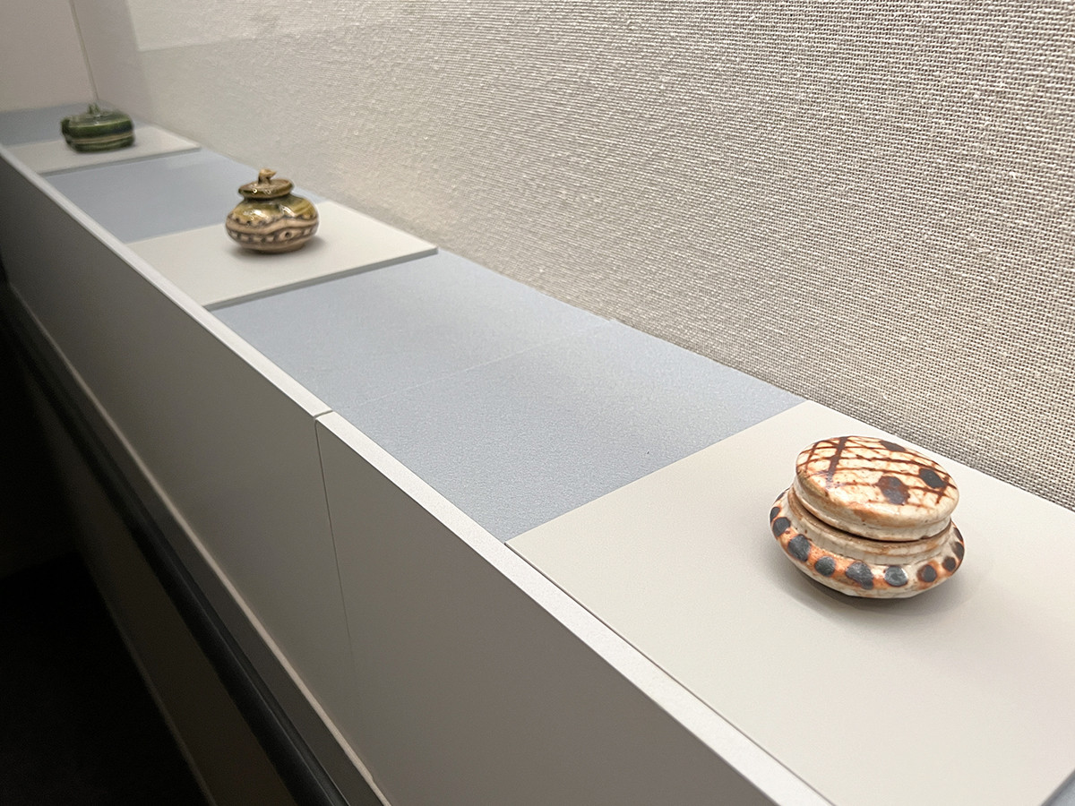 小さな展示室6に並ぶのは、香合です。《志野重餅香合》は、鏡餅のような重ねた餅をイメージしてつけられた名称と思われます。