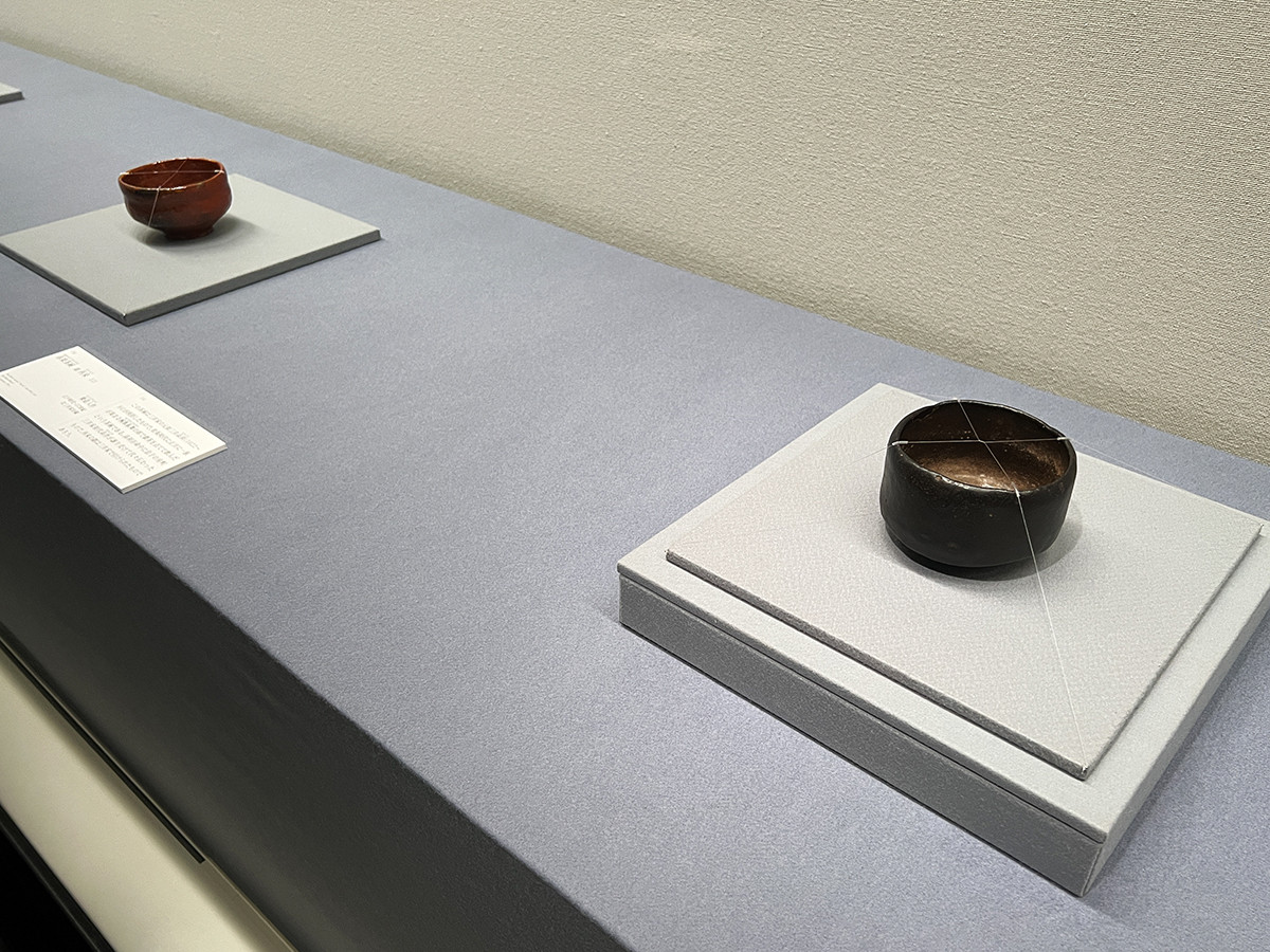 (左奥から)《赤楽茶碗 銘再来》樂道入 江戸時代 17世紀 北三井家 / 重要文化財《黒楽茶碗 銘俊寛》長次郎 桃山時代 16世紀 室町三井家[展示期間:7/9~8/7]