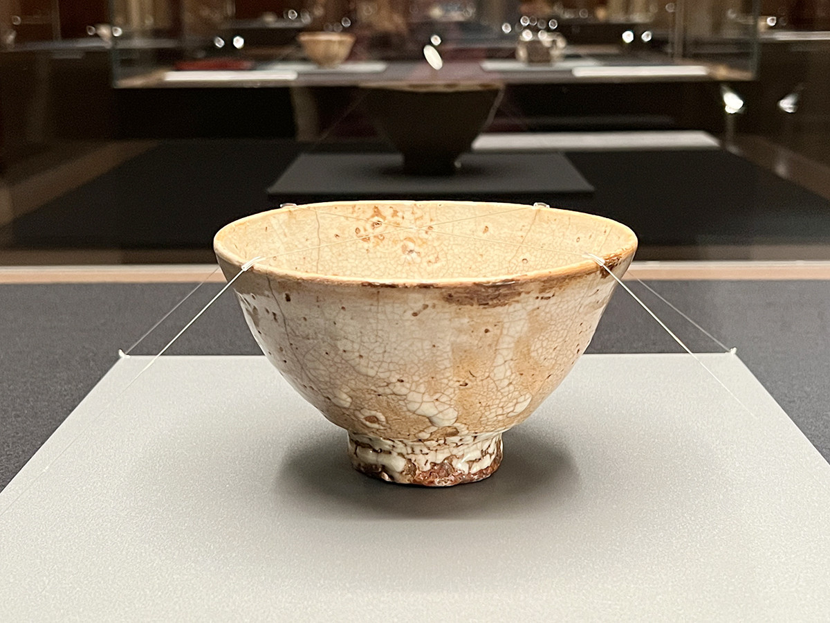 展示室2では、三井記念美術館が誇る国宝《志野茶碗 銘卯花墻》。日本で焼かれた陶磁器の中で国宝は2碗しかなく、そのうちの1碗がこちらです。