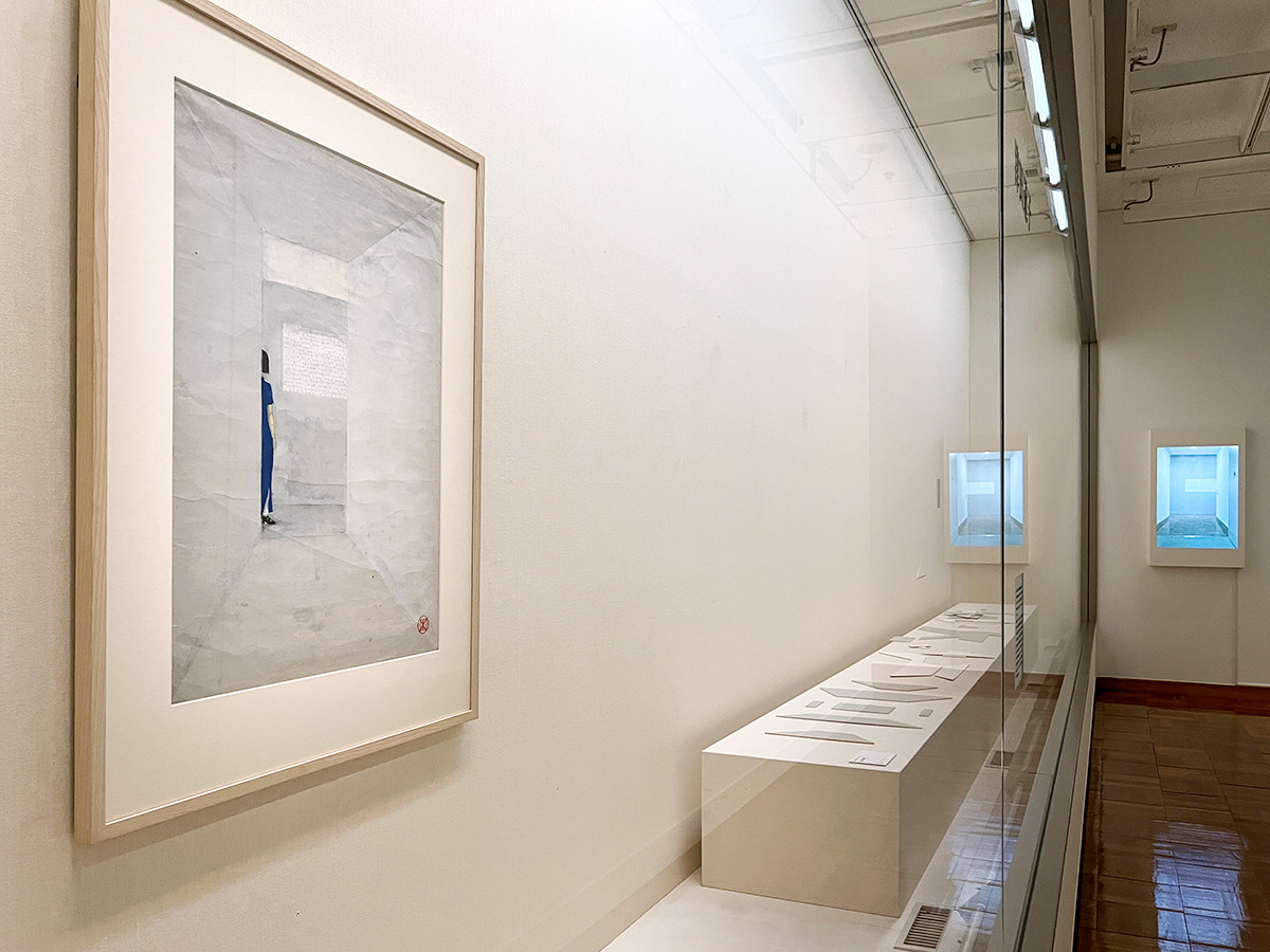 津田道子は、恩地孝四郎の版画作品を使ったインスタレーションです。恩地の《白亜(蘇州所見)》は白い壁に囲まれた空間の作品ですが、津田は作品をバラバラのパーツにしたかと思えば、正面のモニターには《白亜》そっくりの風景が。千葉市美術館の中に《白亜》そっくりの場所を見つけて、動画として上映しています。