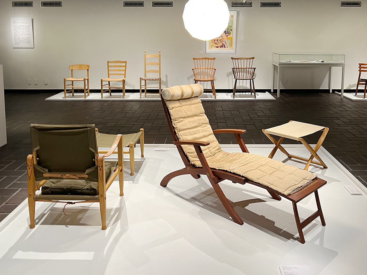 第1章「デンマークの椅子」 セクション5「デザイナーたちの挑戦」 (上段右手前)ハンス J. ウェグナー《ヴァレットチェア》1953年 織田コレクション(東川町) / (下段右手前)ハンス J. ウェグナー《ベアチェア》1951年 織田コレクション(東川町)