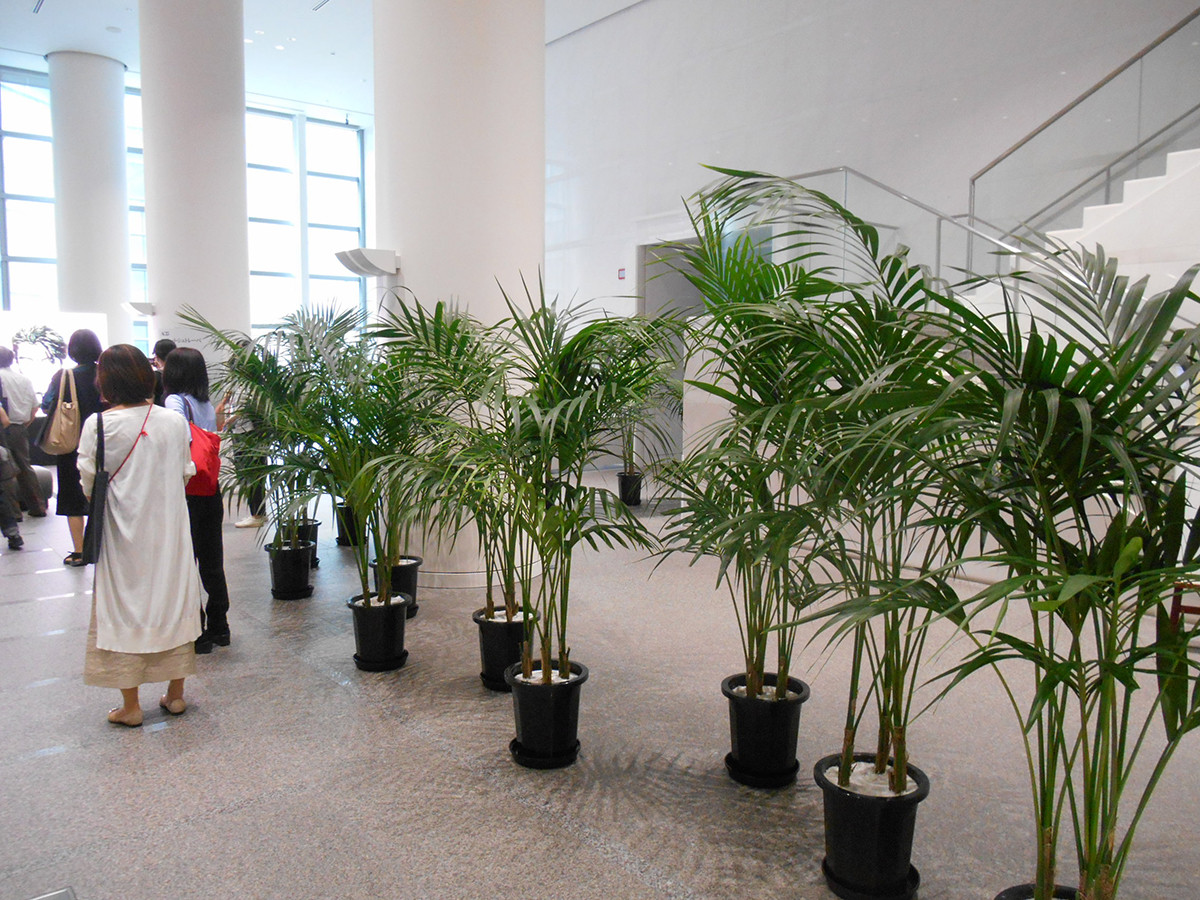 8Fに降りると、ロビーにヤシの鉢植がたくさん並んでいます。見ようによっては、ヤシの鉢植が展覧会の行列に並んでいるように見えておもしろいです。言うまでもなく、これらの鉢植は境界として配置されているのではなく、れっきとした作品です。