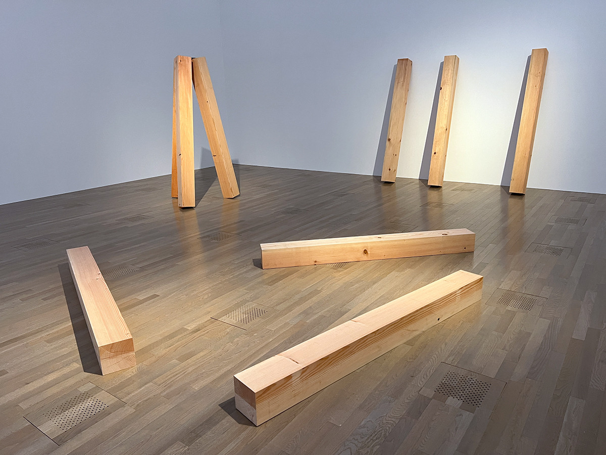 石、ガラス、鉄板などを用いた〈関係項〉は、今日まで制作され続けているシリーズ。木製の角材が組み合わさって置かれた作品や、鉄板が少しずつ位置をずらしながら壁から床に設置された作品などは、同時代のミニマル・アートの傾向との一致も見られます。