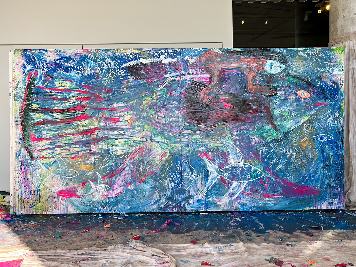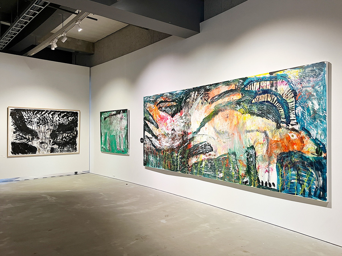 時には音楽家とコラボしながら、延べ50回以上のライブペインティングを実施。ここでは2016-2019年のライブペインティング作品など、絵画の近作が一堂に会します。