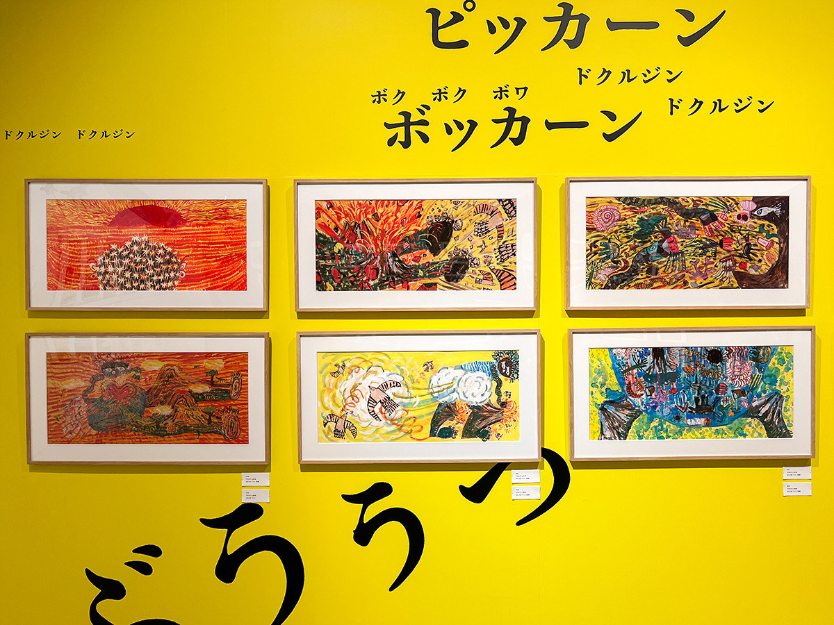 ここでは、第26回ブラティスラヴァ世界絵本原画展で金牌を受賞した『けもののにおいがしてきたぞ』(2016年 岩崎書店)、『まっくらやみのまっくろ』(2017年 小学館)、『ドクルジン』(2019年 亜紀書房)と、3冊の原画を展示。オノマトペの文字が配された会場壁面もユニークです。