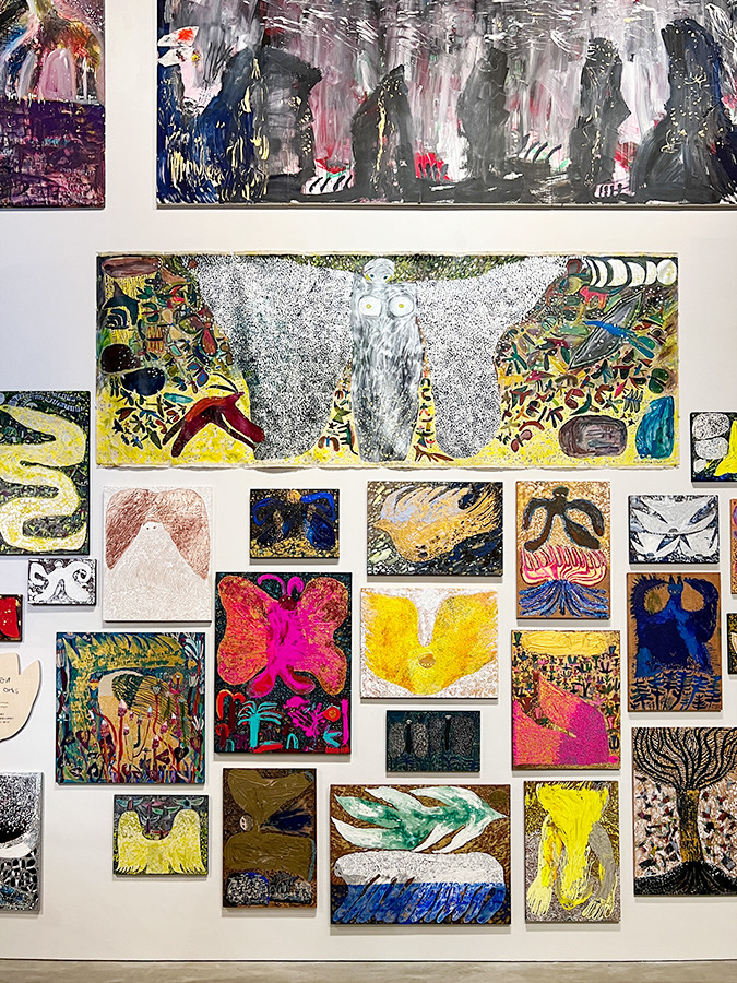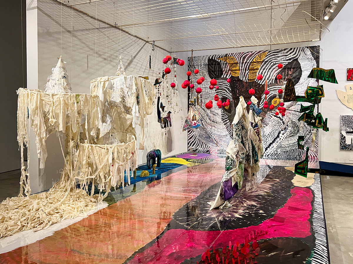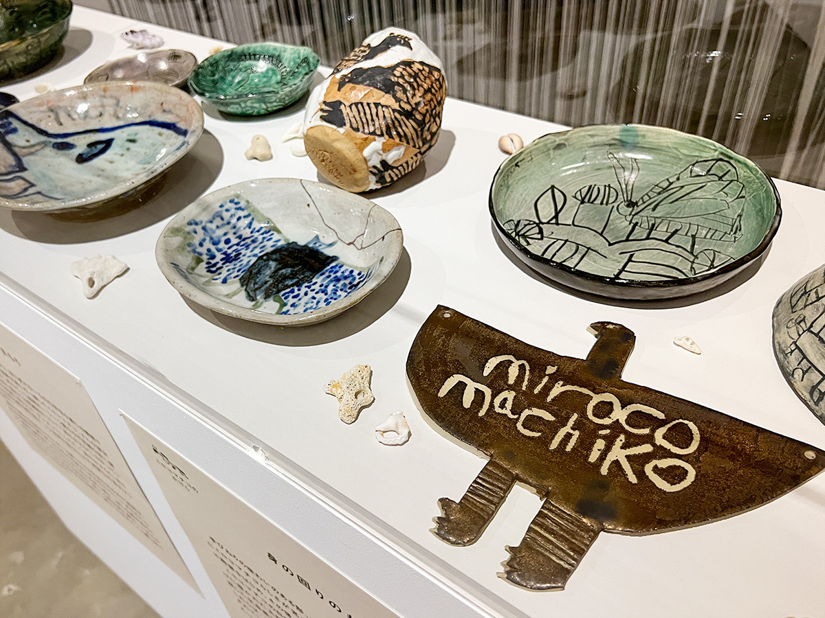 下のフロアに進み、最後は「新作」。作品の中をくぐり抜けるようなインスタレーションや、やきものの作品、高い壁面の最上部まで架けられた絵画など、さまざまな作品が展示されています。