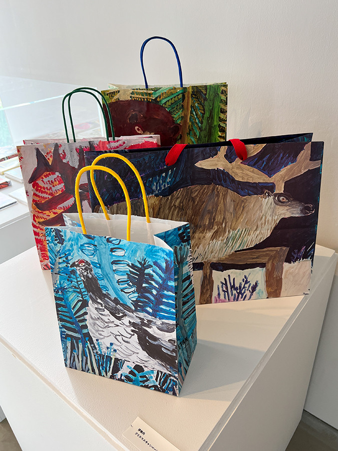 会場には、伊勢丹のショッピングバッグのほか、『万引き家族』の表紙絵などもあります。