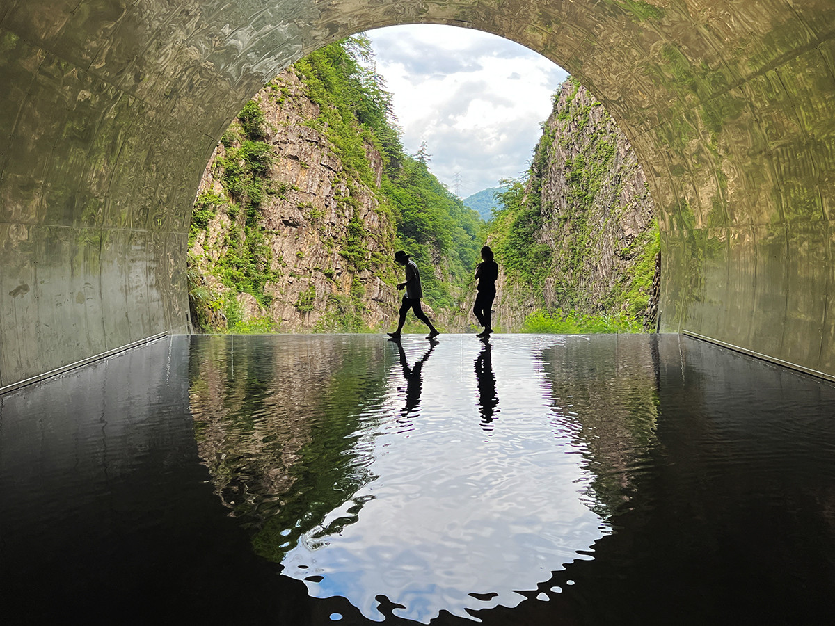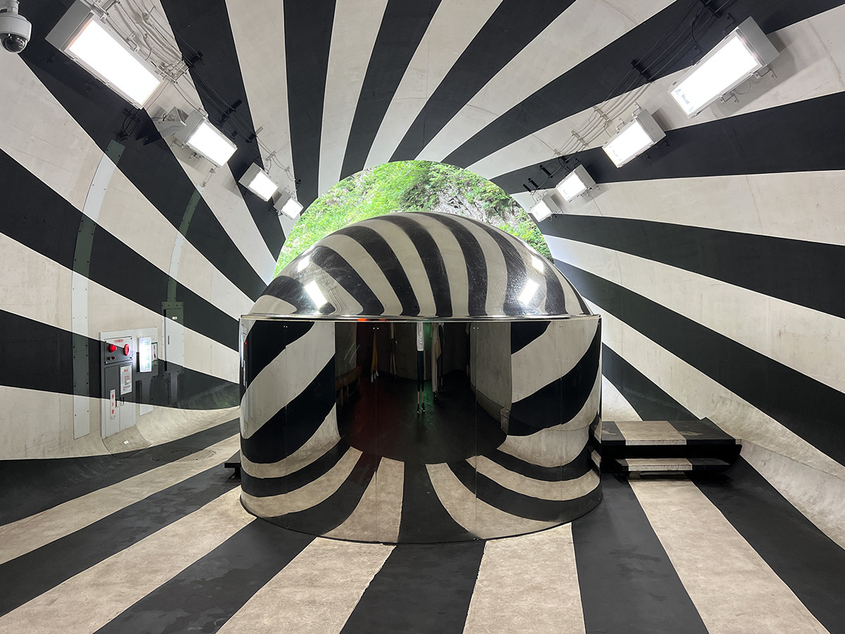トンネル内は、途中に見晴所が3カ所。第1見晴所では清津川の清流が見られるだけですが、第2見晴所は“見えない泡”をイメージ。壁面のストライプ模様が中央のカプセル状の物体に映り、奥まで進むと清津川が見えます。