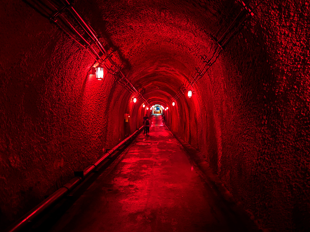 トンネルの全長は750m。アート作品になる前は「移動中が退屈」という声もあったそうですが、現在では途中で照明の色が変わり、ドラマチックな空間の中を進んでいくことになります。