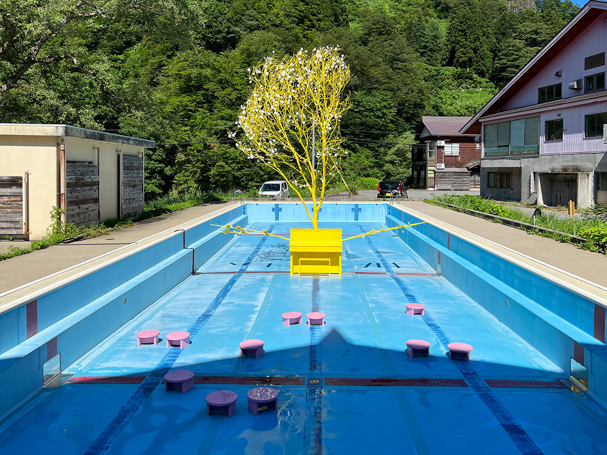 旧小学校のプールには、翼の生えた木が伸びている黄色いピアノ。鑑賞者にプールに降りてもらい、ピアノに触り、音を聴くように誘います。