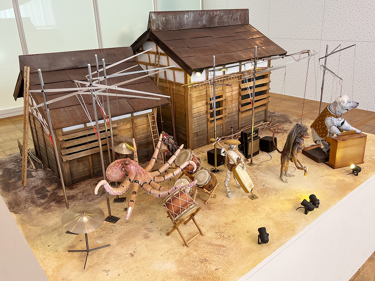 教室にはいくつか作品がありますが、印象的だったのがこちら。古民家をかたどった舞台で、動物の姿をした自動人形がバンドを組んで演奏します。