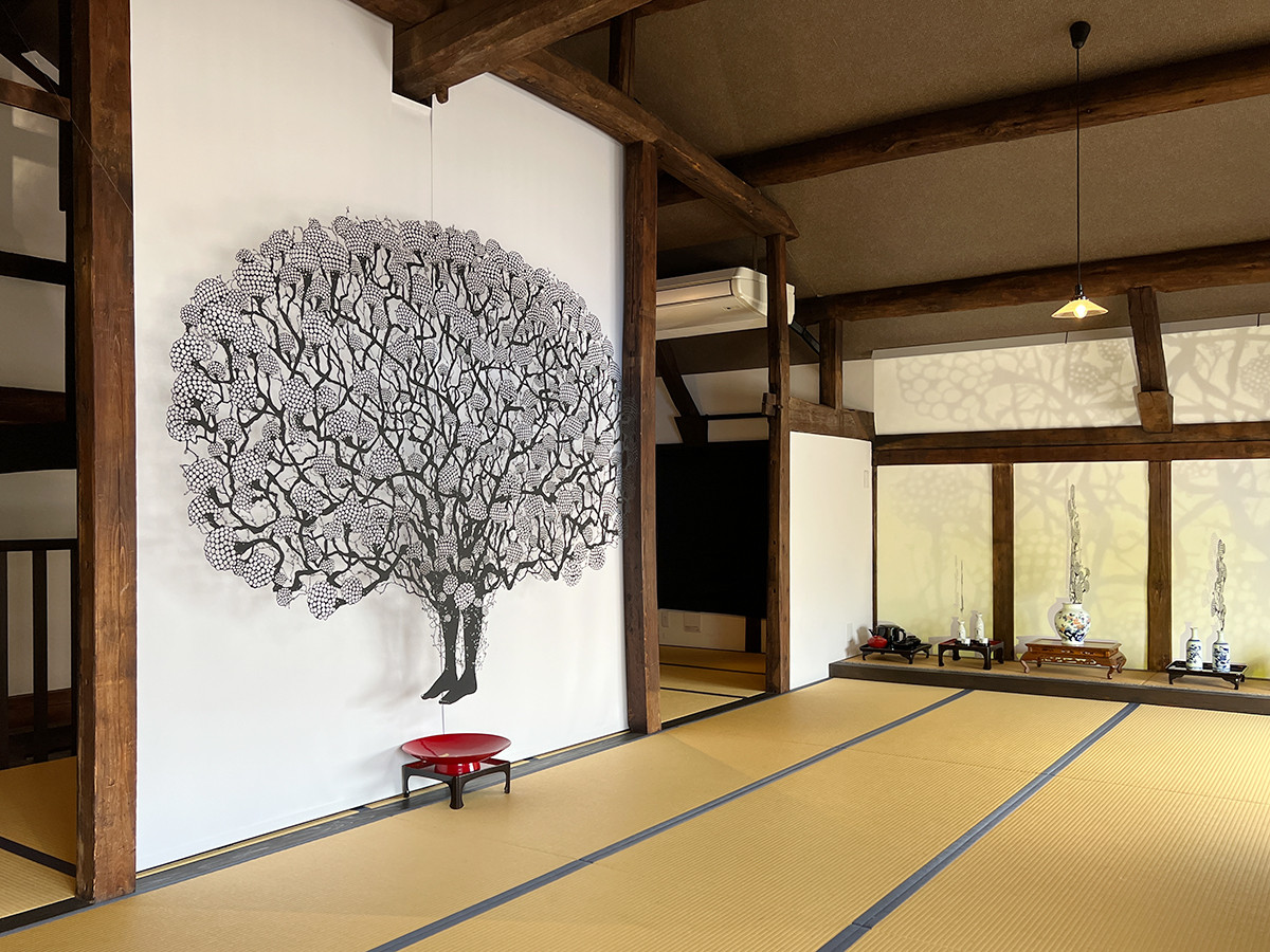 テグスで吊られたオブジェは軽いため空気の流れで動き、平面でありながら立体的。オブジェの影も含めて、不思議な存在感を放ちます。