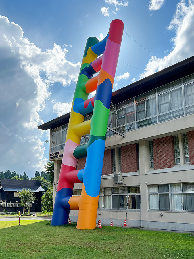 越後妻有「上郷クローブ座」は、旧津南町立上郷中学校をパフォーミングアーツの拠点として整備したもの。旧校舎には巨大なバルーンの梯子が掛けられています。