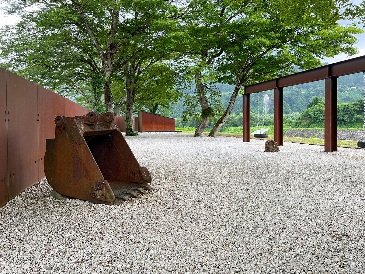 立地は田んぼと川の間で、かつて廃棄物が不法投棄されていた場所。コールテン鋼の壁で囲われ、周辺の環境も含めて精神性が高い空間になっています。