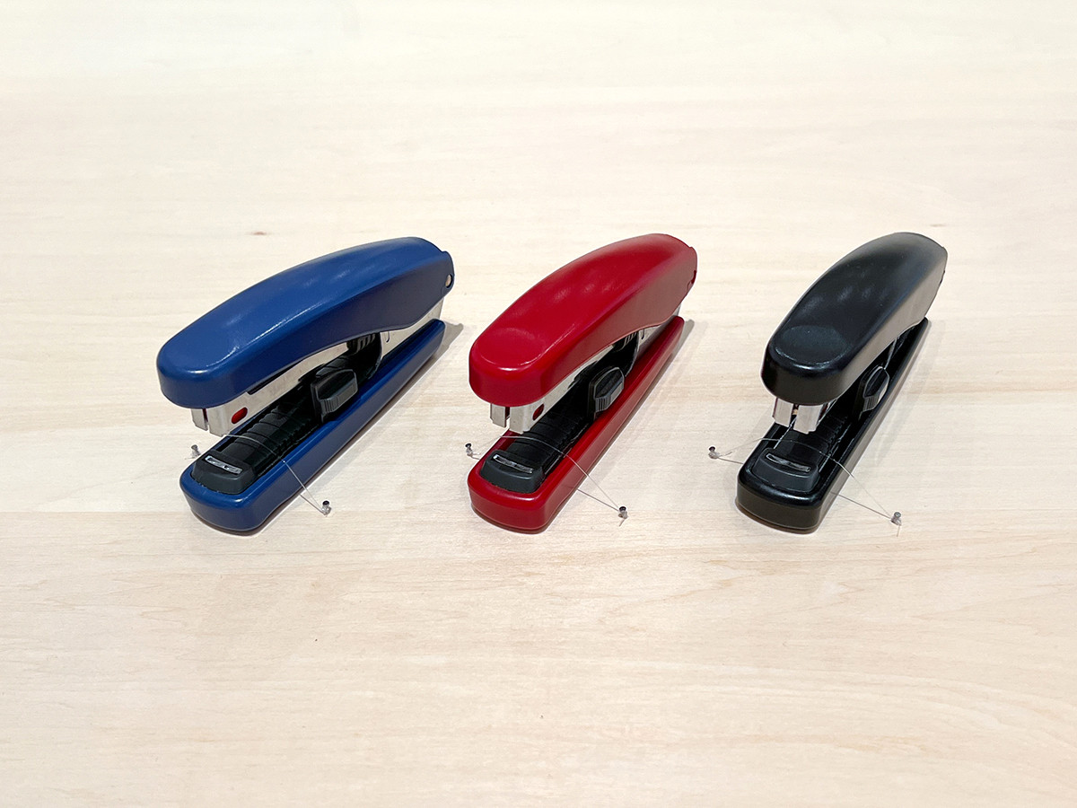 明るい色調のホッチキスもデザイン。手のひらに収まるサイズで、軽い力で綴じられるように、細部にわたって使い易さを追求しました。