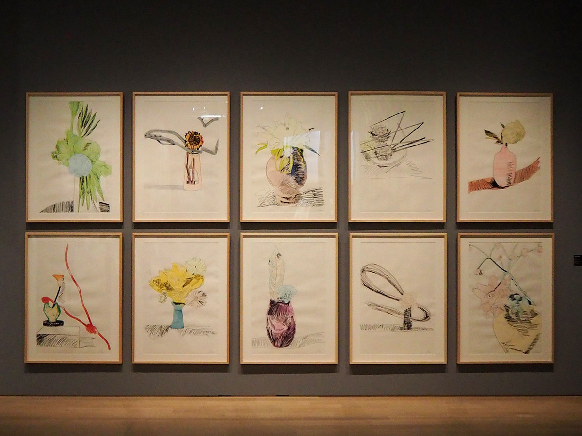 1974年に再び京都を訪れたときには、特に「生け花」に影響を受け、多くの生け花に関する書籍も収集していました。それらの図版をもとに制作された《花》。色を付ける際、イラストレーター時代のスタイルで1つ1つ手彩色しているのも興味深いところです。