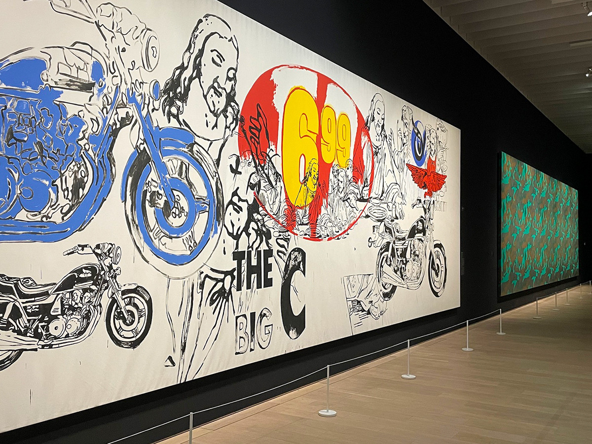 約295×約990㎝の大型作品《最後の晩餐》も日本初公開。1984年から2年間で100点以上制作されたシリーズの1点です。キリストの救済が主題となっていて、「人間の生きる世界は儚く移りゆくものである」ことが描かれています。ダ・ヴィンチのフレスコ画《最後の晩餐》を参照していますが、複製画の伝統にとらわれず、カラフルでロゴや記号が溢れている点に彼らしさを感じます。