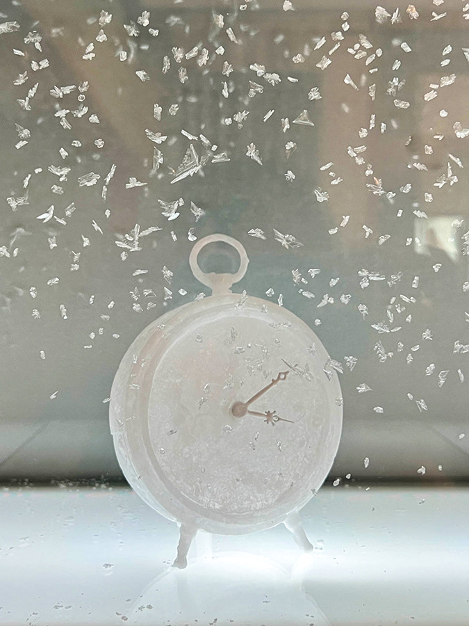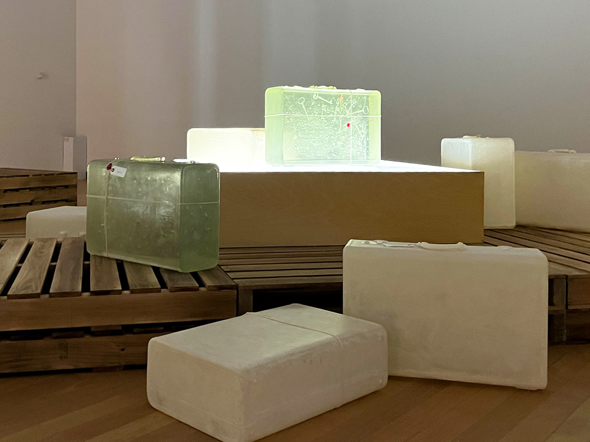 宮永愛子(1974-)は、常温に置くと気化するナフタリンや塩など、周囲の影響を受けやすい素材を用いて作品を発表しています。木製パレットの上に置かれた透明のトランクの数々からは、空港や港など多くの人が往来する場所を連想させます。 また、封入された白い鍵や赤い蝋で留められた封印から、過去の経験とのつながりや旅と時間の結びつきを感じさる作品です。