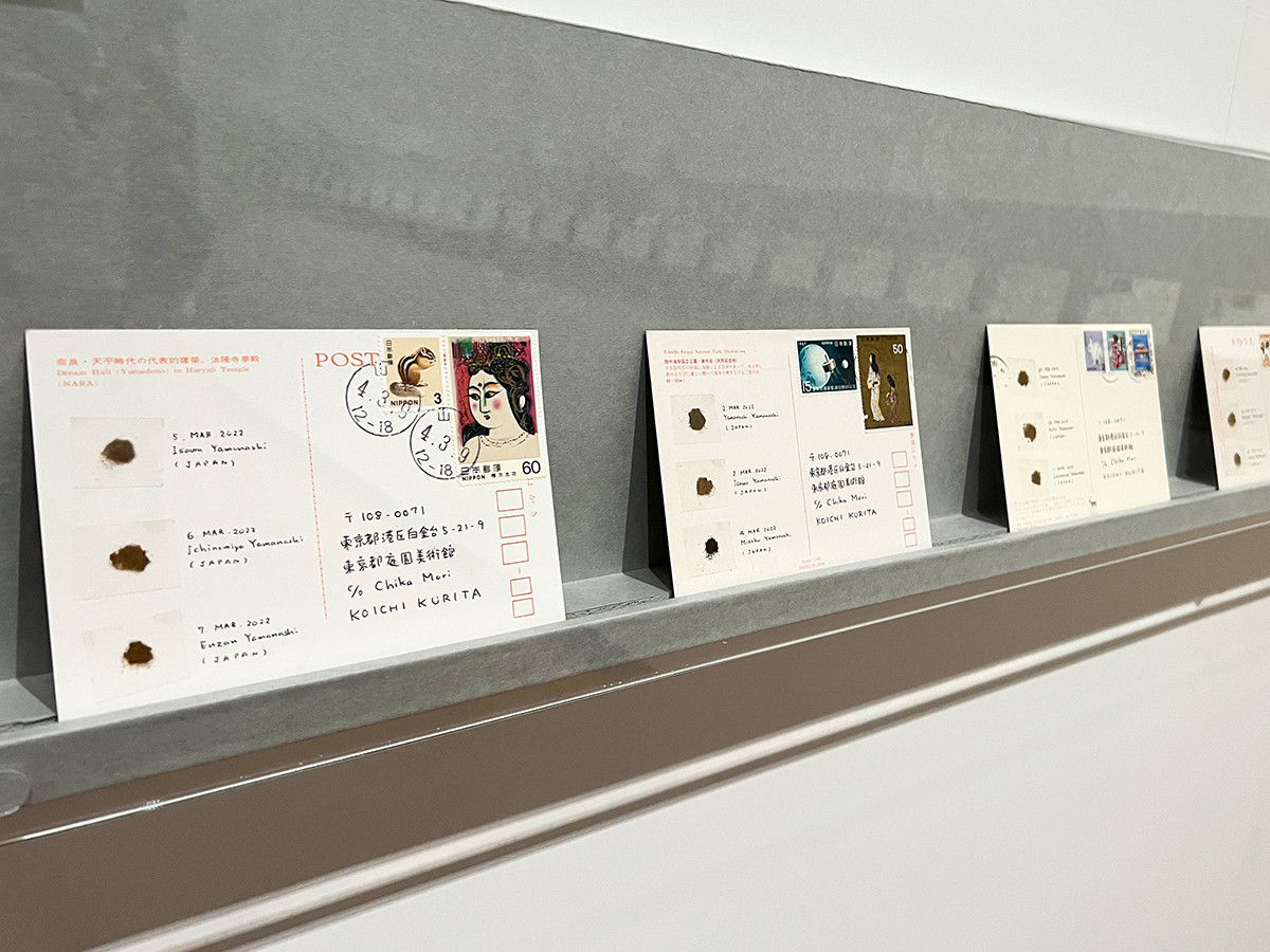 栗田宏一(1962-)は、20代半ばからバックパッカーとして世界各地を旅して採取した土を壁一面に配置するインスタレーションを作成。栗田は、各地の風土の中に身を置くことで自然と人に対する思考を高めているといいます。 会場には、2021年11月から現在に至るまでの約300日の日々の土採取を記録する絵はがきシリーズも展示しています。
