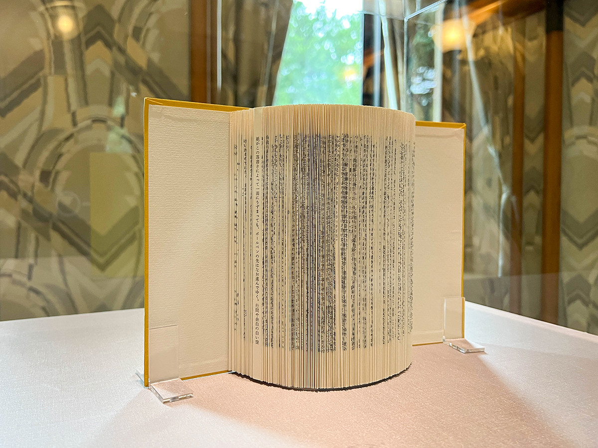 福田によって1頁1頁折りたたまれた本の中から、偶然に現れる1行の文字。折りたたまれたことで、文章のすべては読めませんが、残った1行から見る者の記憶や想像力をかき立てられる作品です。