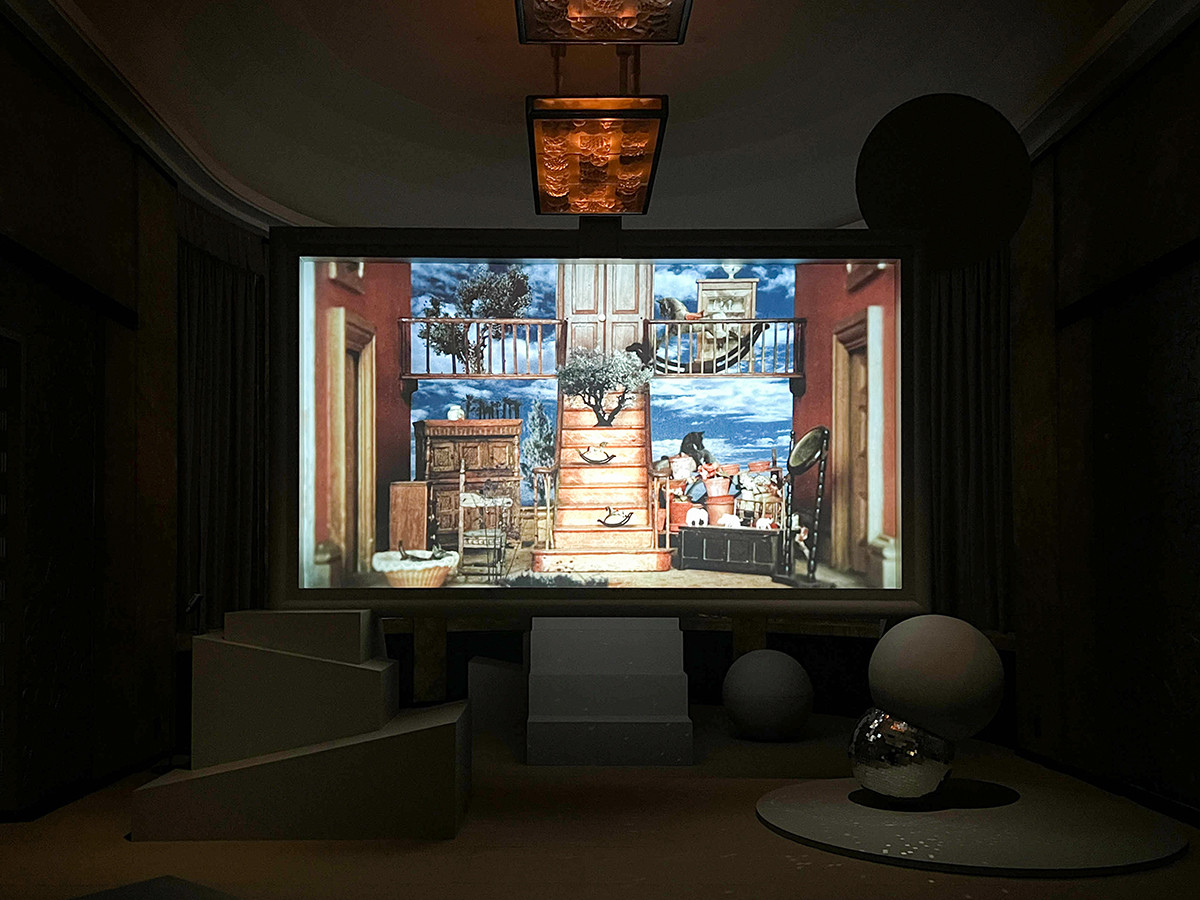 続いては、日常の見慣れた風景の中に存在しない要素をもちこんだ映像を生み出す、さわひらき(1977-)。1階の大食堂では、旧朝香宮邸で撮影した実写映像にジェット機や飛び回るふしぎな生き物が登場するビデオ・インスタレーションを展示しています。